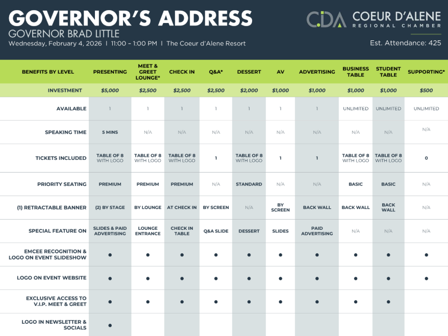 As members of the regional business community, this conversation matters. The Governor’s vision influences how Idaho grows, how industries thrive, and how communities remain strong and resilient. This luncheon offers a rare opportunity to hear directly from our state’s top leader and engage in dialogue that impacts our shared future.
